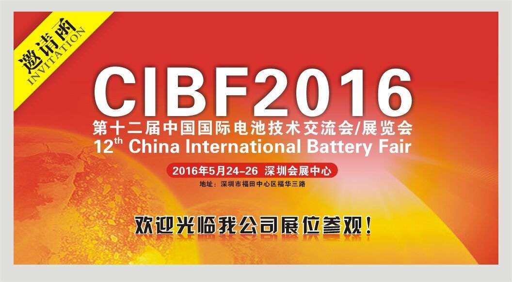 ? ? ? ?2016年5月24日-26日 ?第十二屆中國國際電池技術交流會/展覽會將在深圳市福田中心區(qū)福華三路,深圳會展中心召開,我司展位號:9F90號,歡迎廣大新老客戶,到我公司展位區(qū)域了解新產品和行業(yè)技術交流。